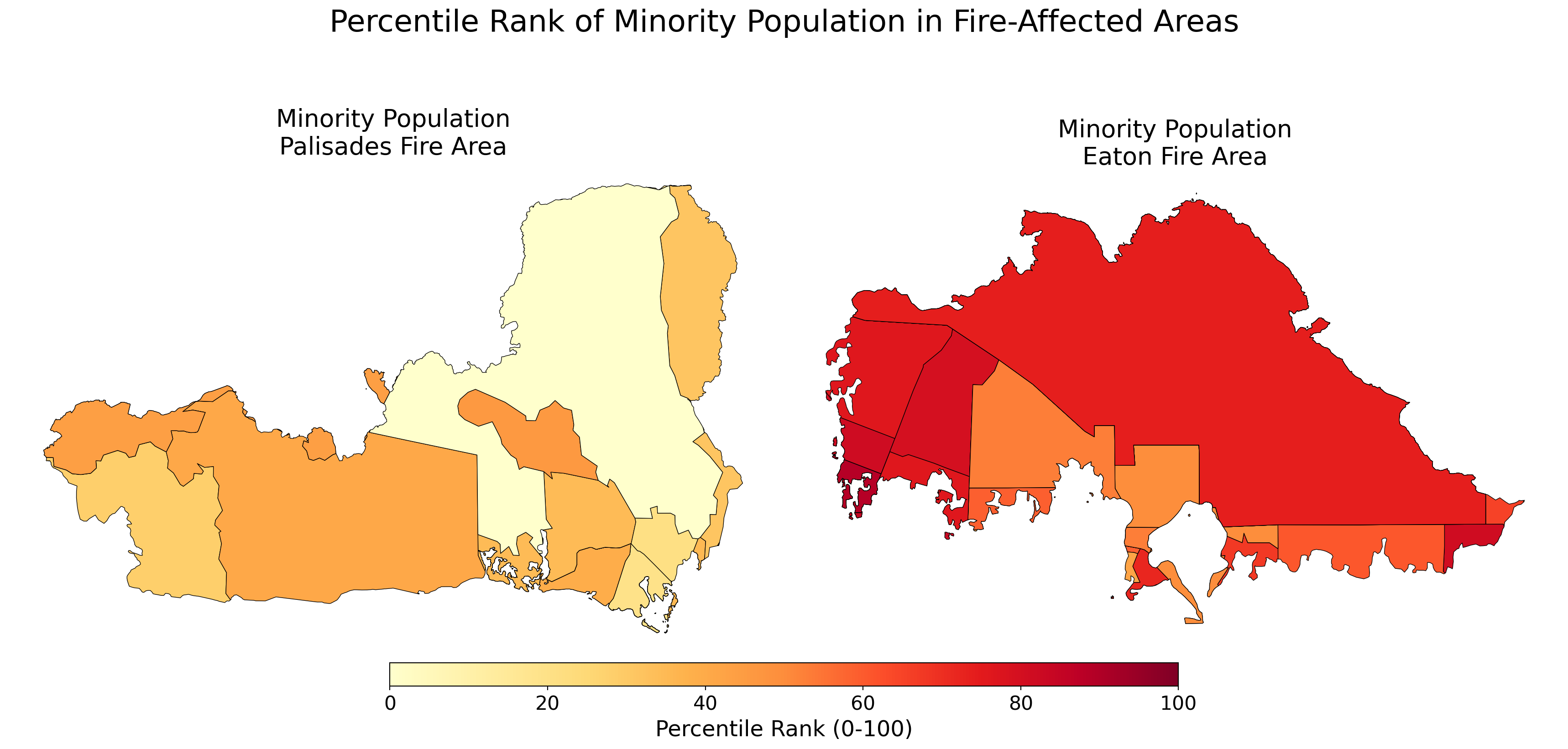 Eaton Fire Area: Dramatically high percentile rankings (70th-100th percentiles, dark red). Nearly the entire burn area shows the highest minority population concentrations in the state. The Eaton fire overwhelmingly affected communities of color, particularly in Altadena.
