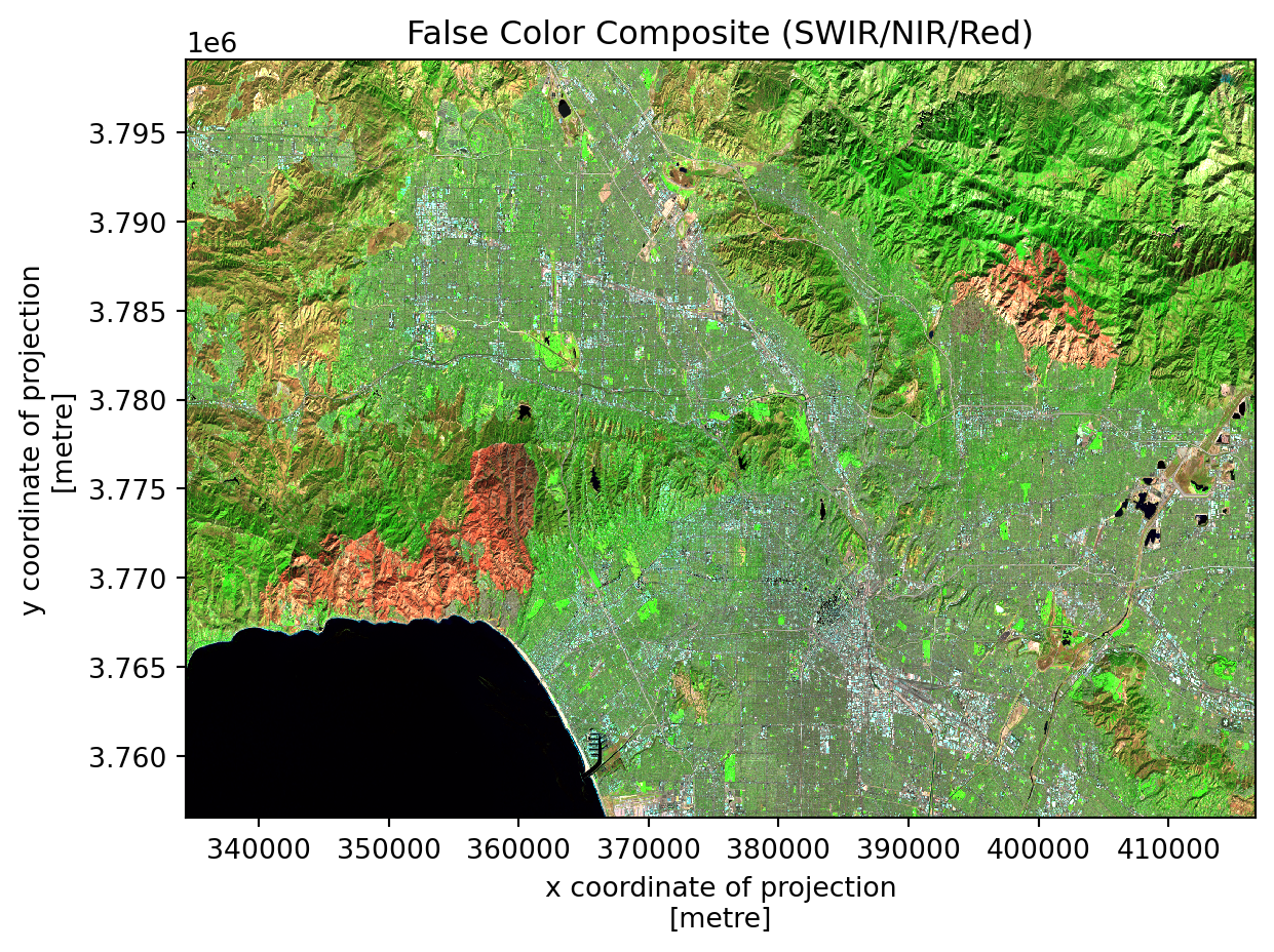 False color composites use non-visible wavelengths to reveal features invisible to the human eye. By assigning shortwave infrared (SWIR) to red, near-infrared (NIR) to green, and red to blue, we create an image where healthy vegetation appears bright green and burned areas show distinct reddish-brown tones.