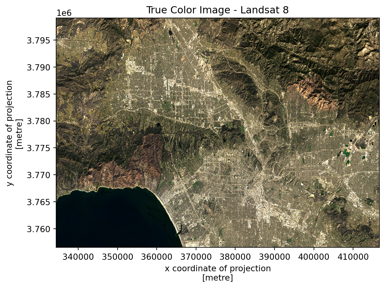 Before creating specialized visualizations, we can verify our data by creating a true color image using the red, green, and blue bands—similar to how a standard camera would capture the scene.