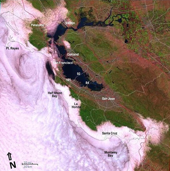 These clouds often push inland through gaps like the Golden Gate and shape microclimates, like in the redwood forests of northern California, that climate models struggle to resolve [@johnstone2010fog].